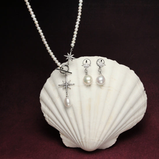 The mosquito-coil clip-on design offers a soft, secure hold without the need for piercings, letting the North Star fall in a long, graceful silhouette finished with a hand-selected freshwater pearl.