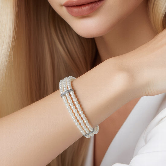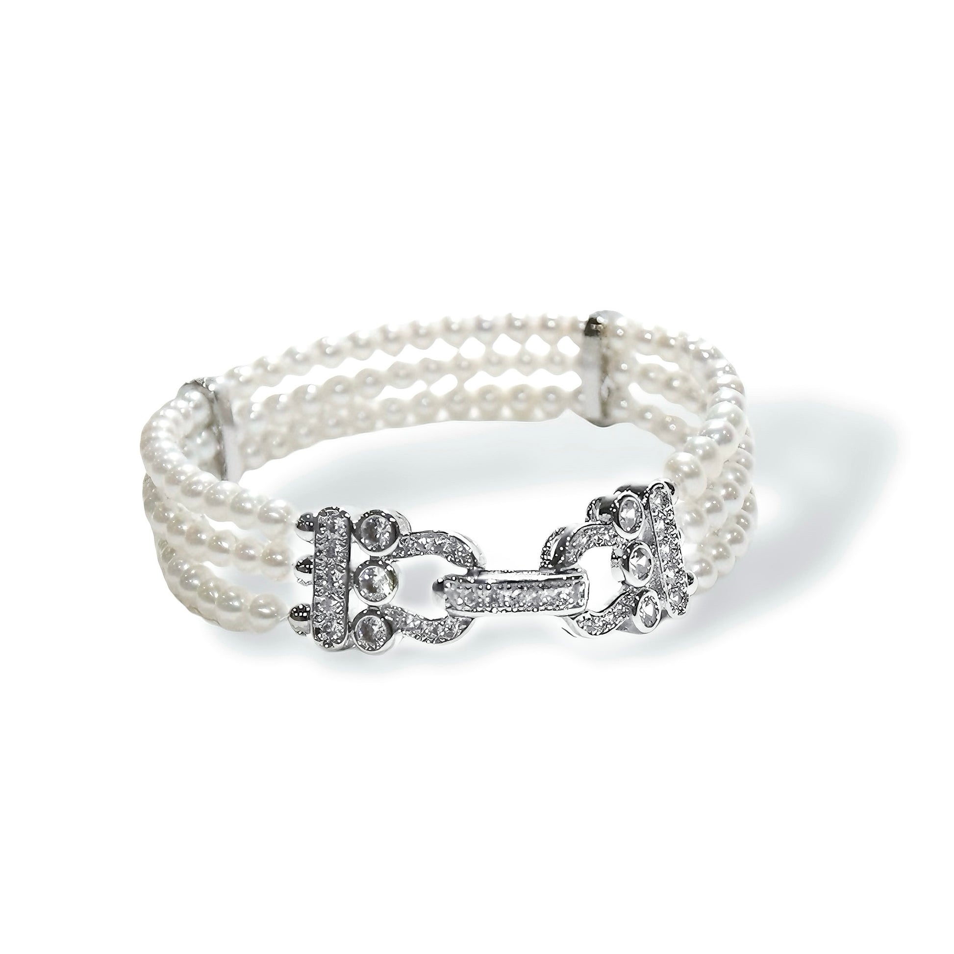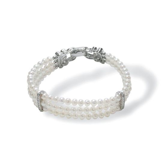 Crafted in London, this bracelet features three strands of hand-selected natural white freshwater pearls, meticulously woven to create a graceful and organic texture.