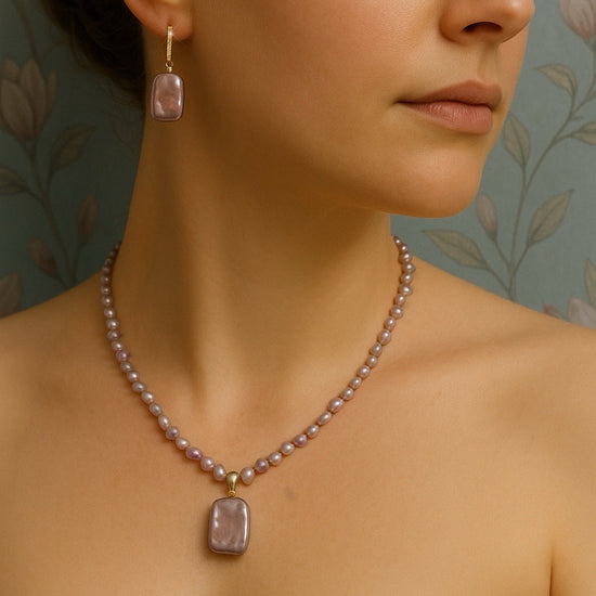 The Rectangular Pink Baroque Pearl Pendant showcases a natural, soft pink-purple Baroque pearl, directly sourced for its unique beauty and luster.