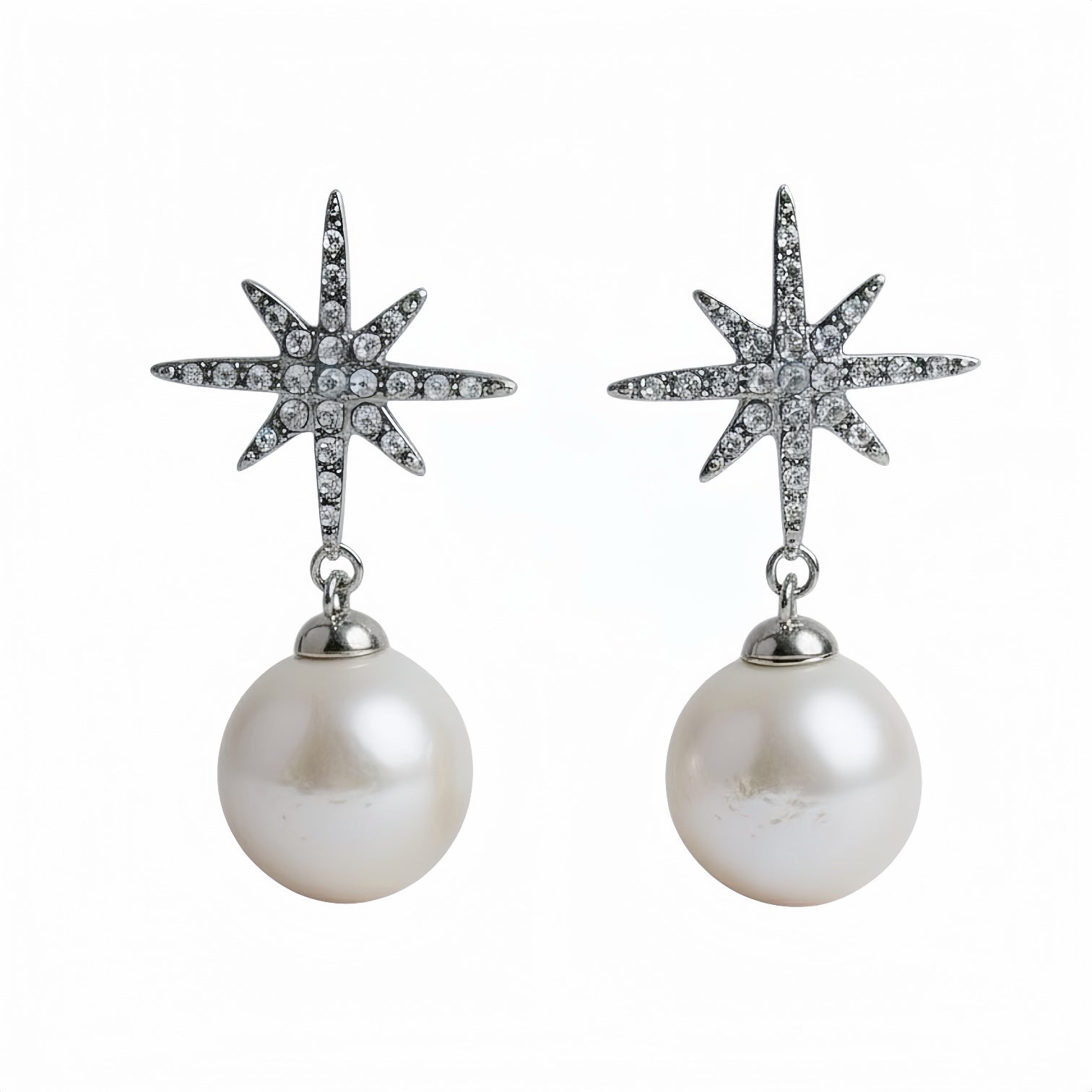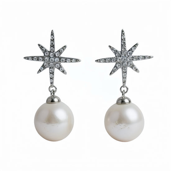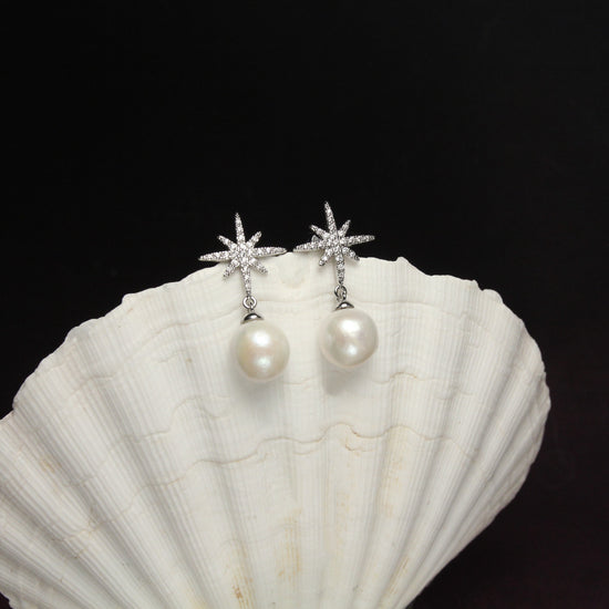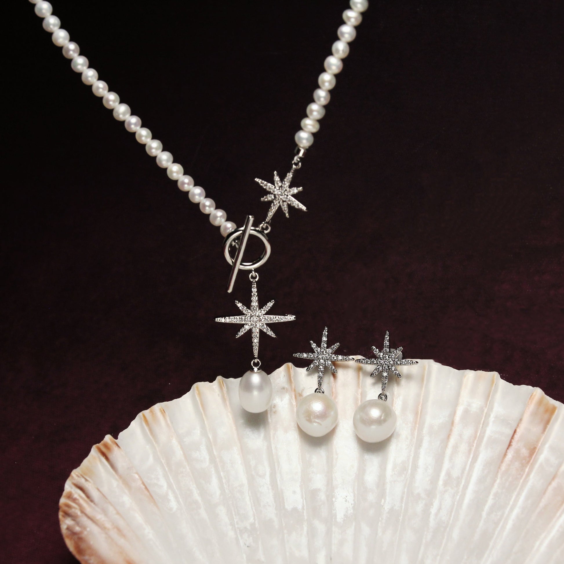 These North Star earrings fall in a graceful 15cm line, ending with a hand-selected freshwater pearl — natural, not perfectly round, but chosen for its soft, individual glow.