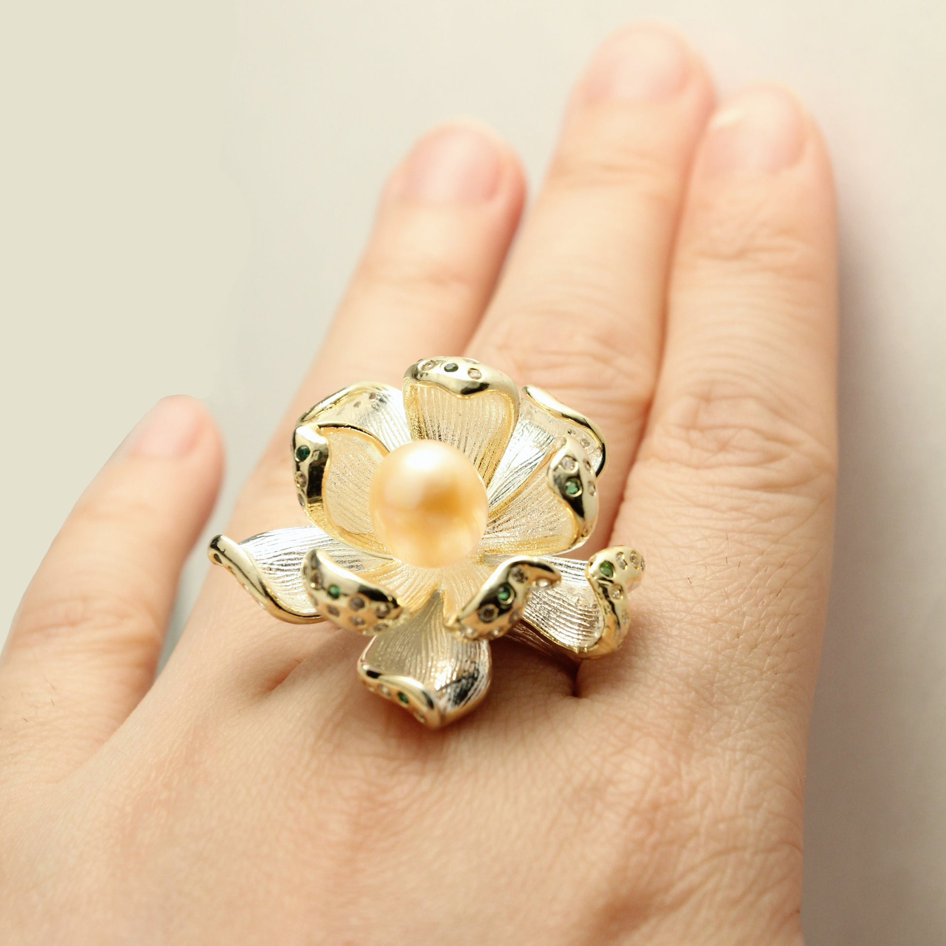 This elegant open-band ring features a perfectly lustrous natural pink pearl set atop a sterling silver band. The beautifully crafted petals are accented with sparkling zirconia stones and finished with delicate gold plating, adding a touch of luxury. With its adjustable open design, this ring is suitable for most sizes, offering both comfort and style. Inspired by the graceful magnolia flower, it’s a timeless piece that blends nature and sophistication, perfect for any occasion.