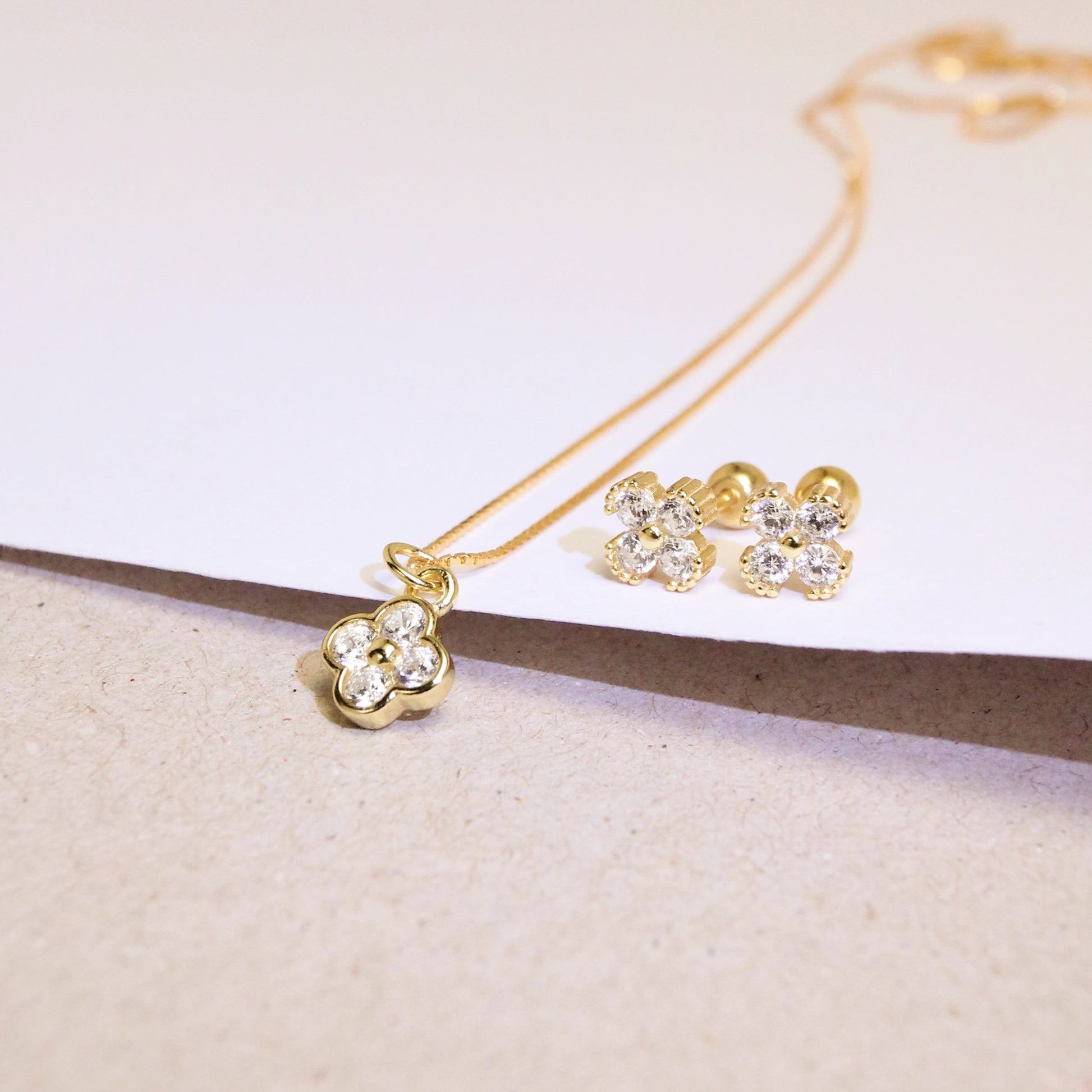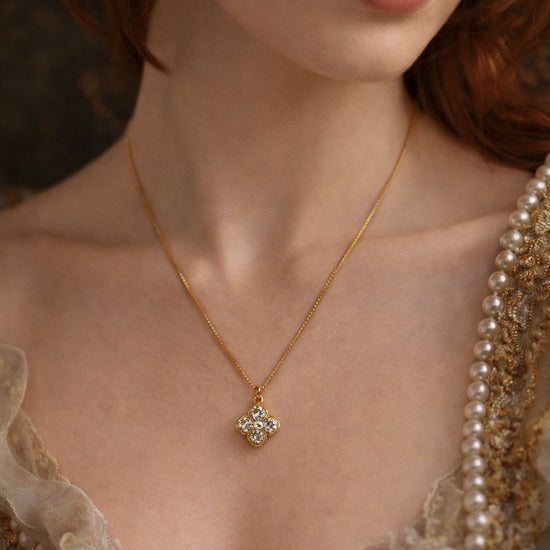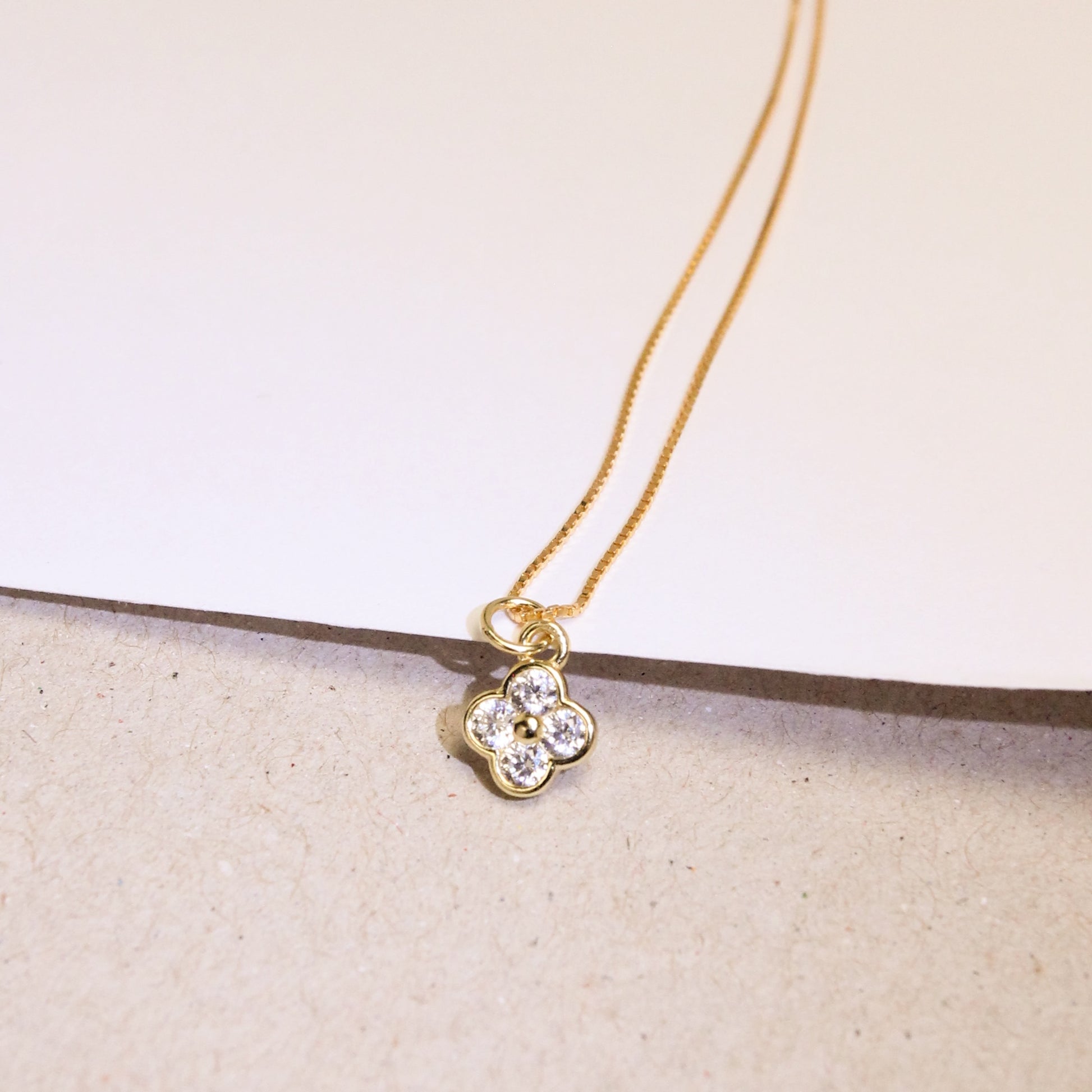 The four-petal motif sits softly at the collarbone, offering understated sparkle that layers effortlessly or stands beautifully on its own.