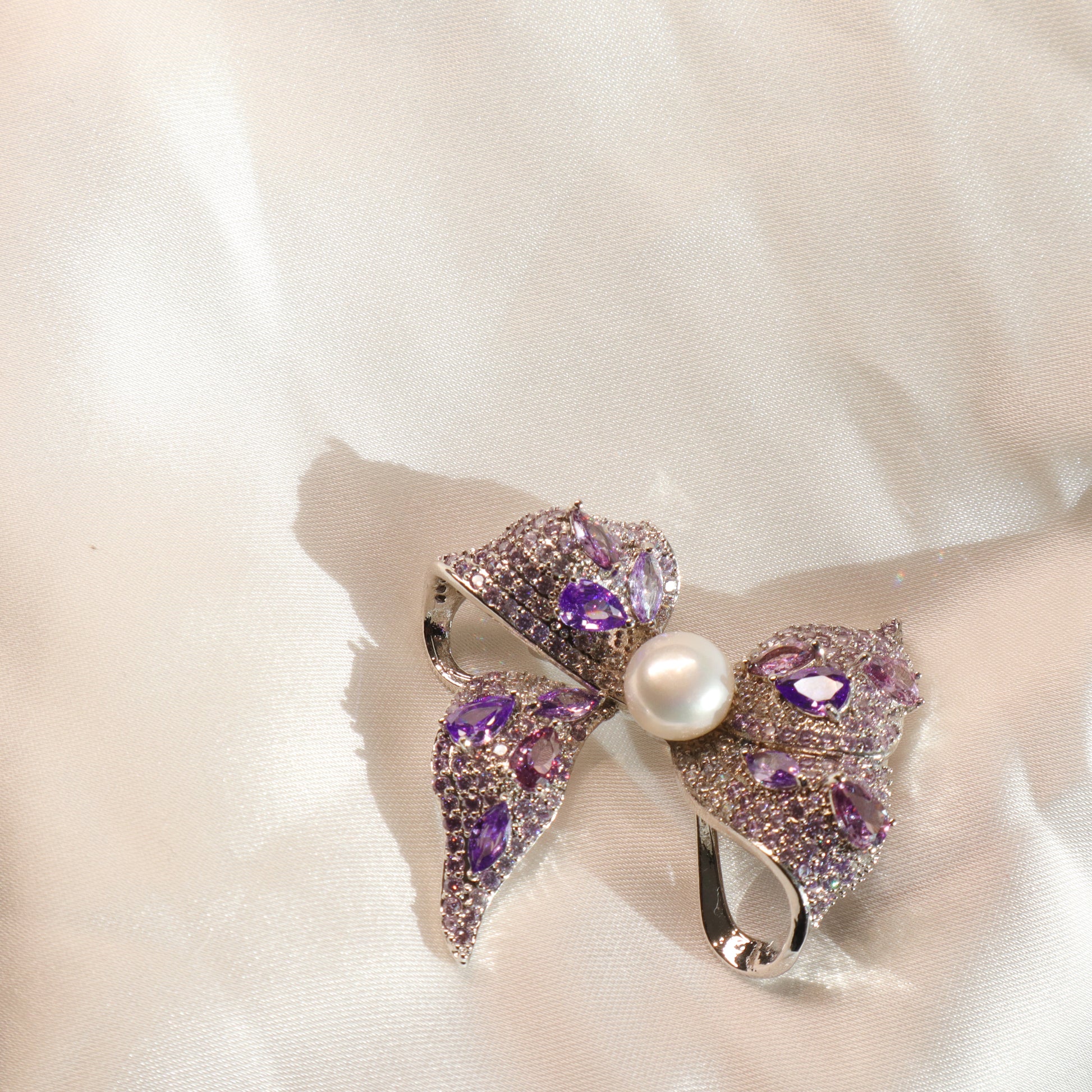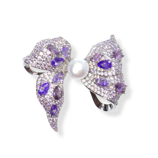 An epitome of opulence, the Majestic Grace Bow Brooch dazzles with a lavish array of shimmering zircon stones and regal pear-cut violet accents. At its heart lies a luminous freshwater pearl, radiating timeless elegance. The sculpted bow design evokes sophistication and grandeur, making it the perfect adornment for special occasions.