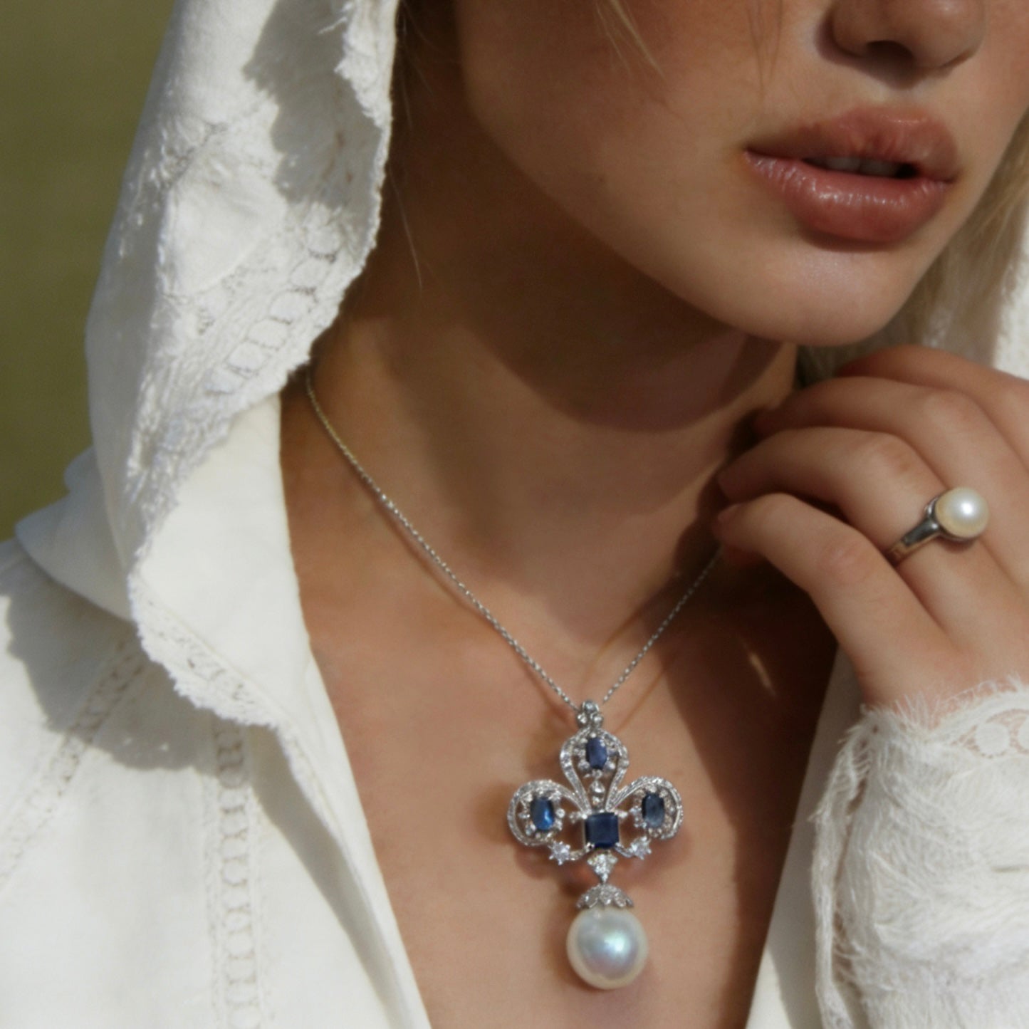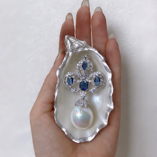 The Royal Blue Iris Natural Pearl Brooch & Pendant combines regal beauty with genuine luxury. Shaped like the majestic iris flower, this exquisite piece is adorned with brilliant royal blue lab-created moissanite sapphires. Suspended from the design is a large, natural baroque pearl, nearly flawless and full of luster. The versatility of this piece allows it to be worn as either a brooch or a necklace pendant, making it perfect for any elegant occasion. Its classical design and luxurious materials make it a standout gift for those who appreciate authentic and refined jewelry.