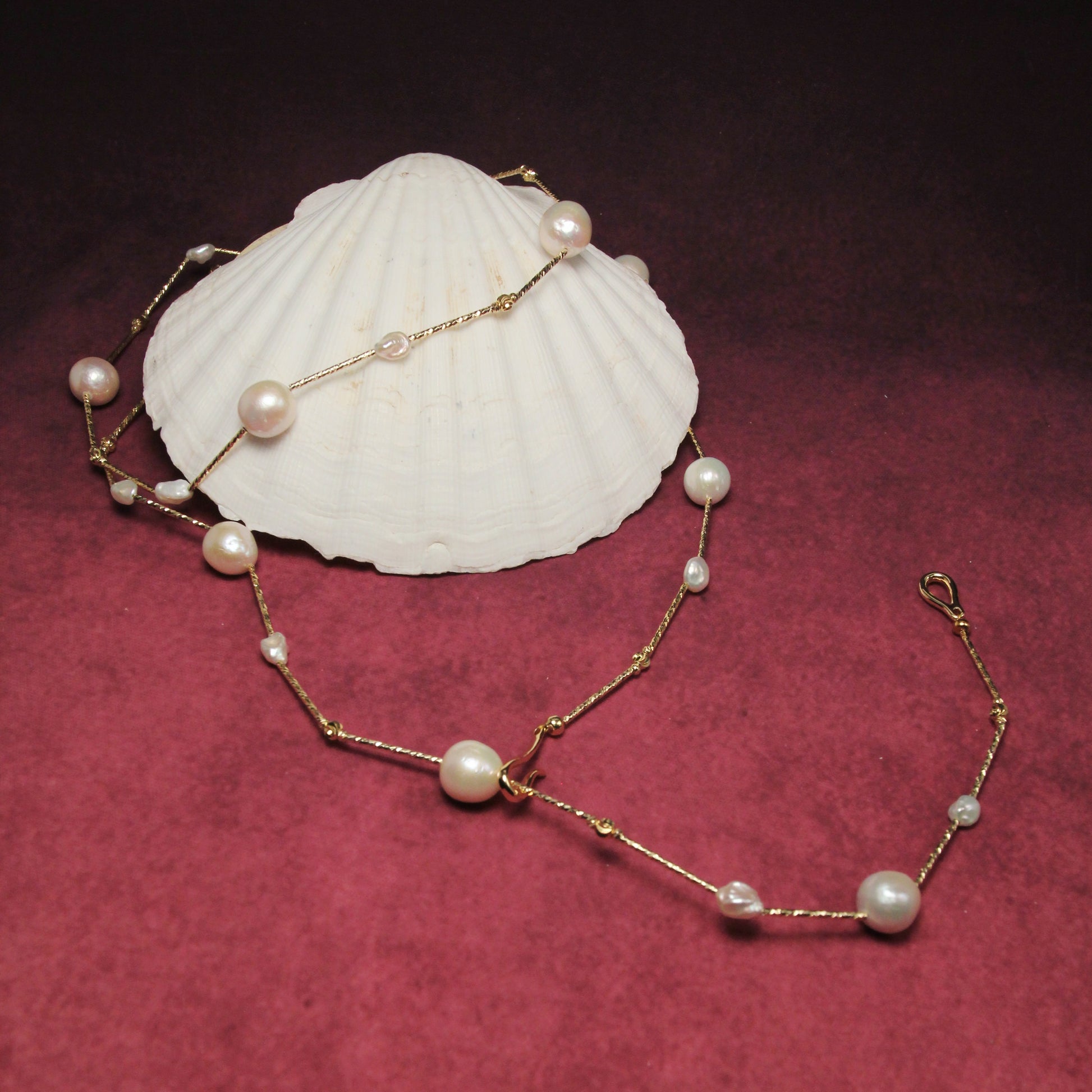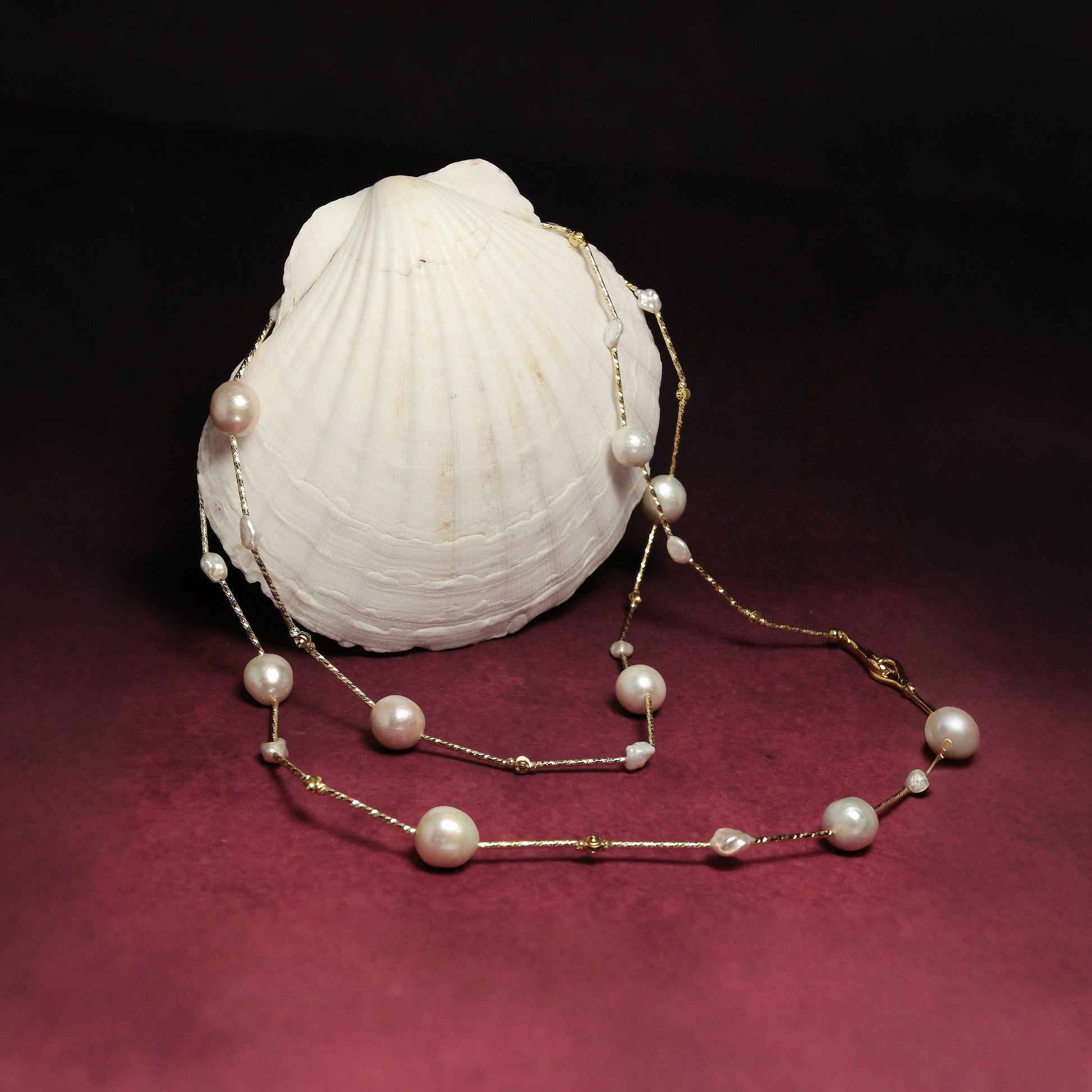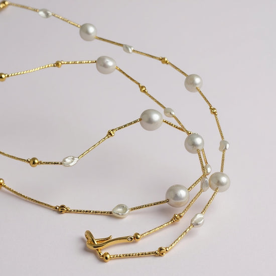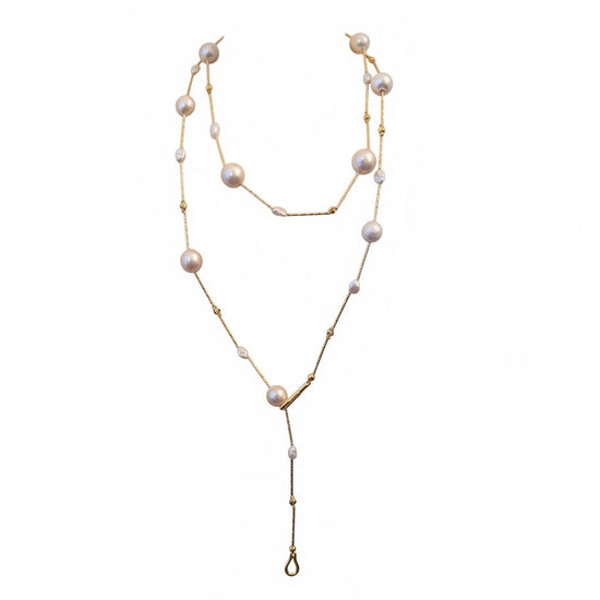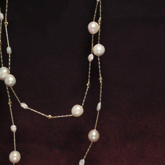 Handcrafted from natural freshwater pearls and 18k gold-filled chains, this 41 in design drapes beautifully whether worn long, double-layered, or wrapped as a choker.