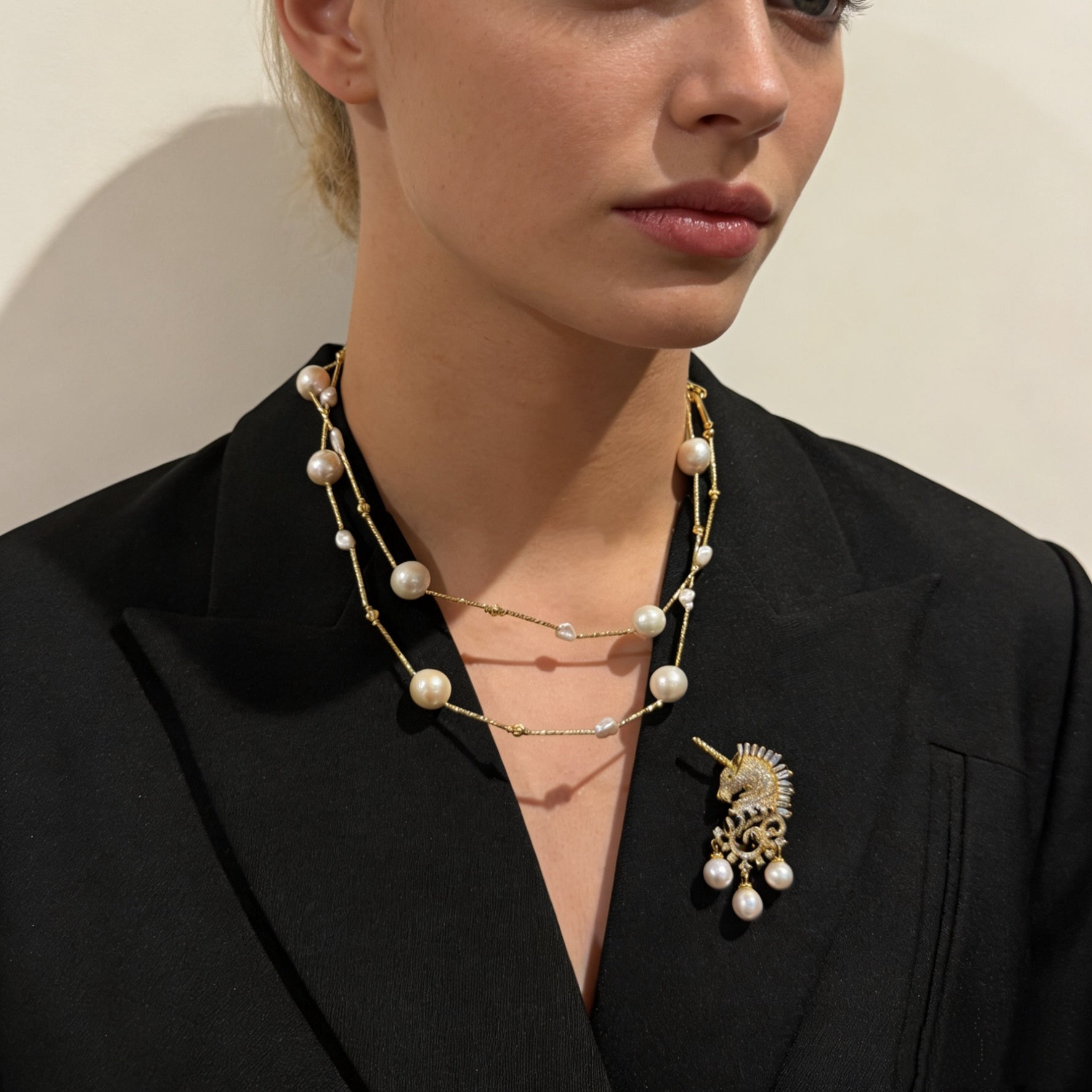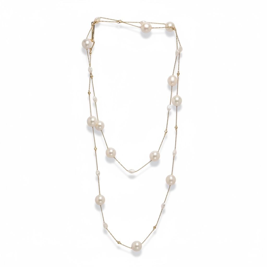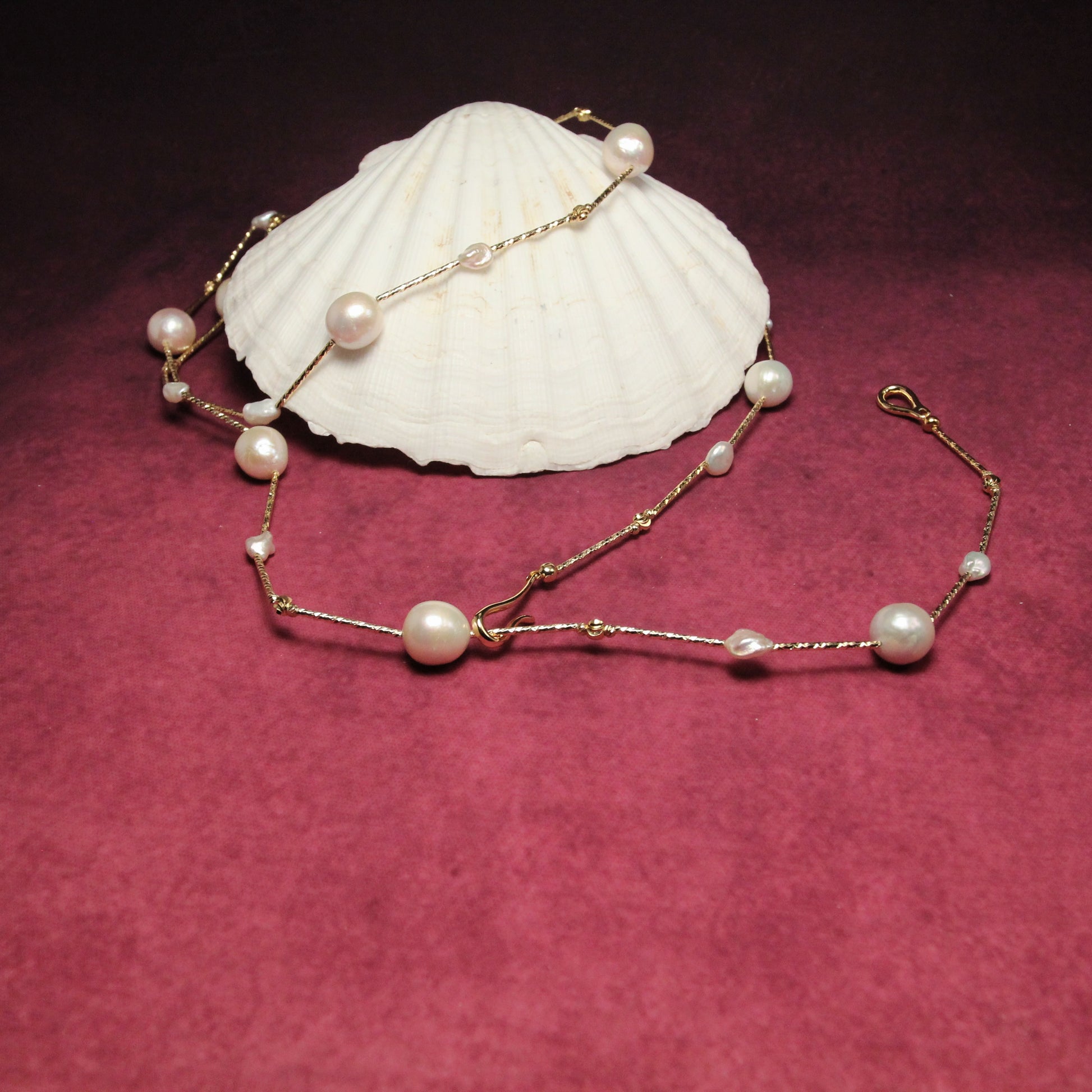 Handcrafted from natural freshwater pearls and 18k gold-filled chains, this 41 in design drapes beautifully whether worn long, double-layered, or wrapped as a choker.