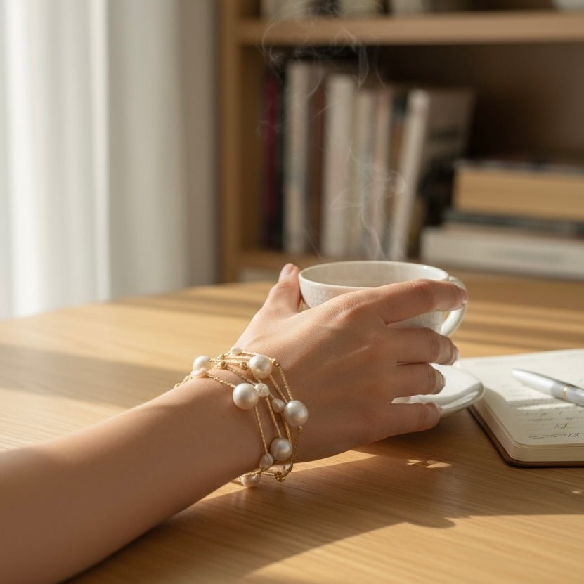 Each pearl glows softly against the golden thread a reminder of serenity and rhythm, much like the moon’s path over a still sea.