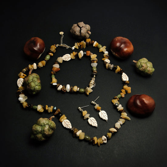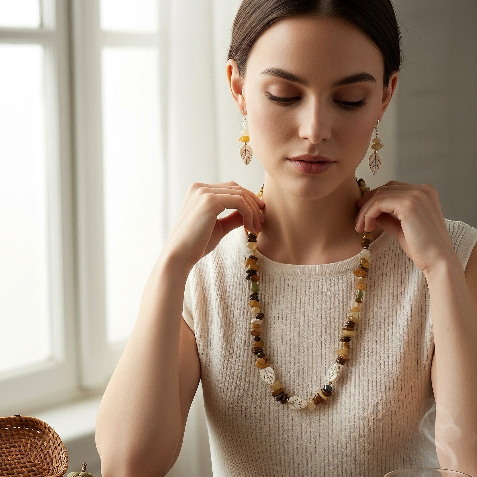 Embrace the enchantment of the season with our "Autumn Enchantment Gemstone and Pearl Necklace." Inspired by the ethereal beauty of forest nymphs in the heart of autumn, this unique piece captures the essence of nature's transformation.