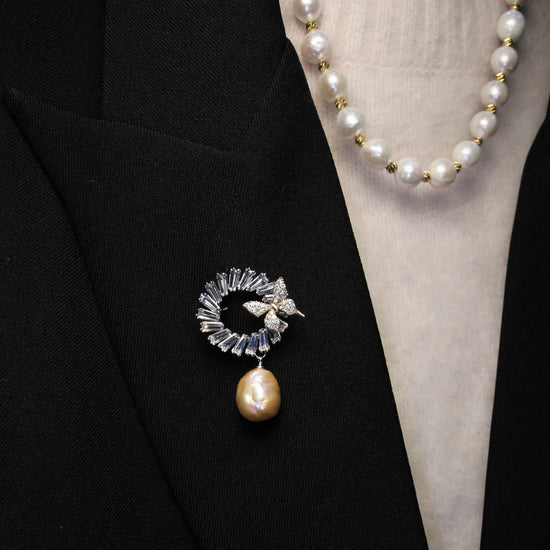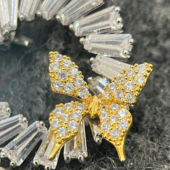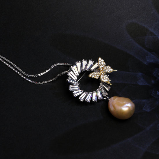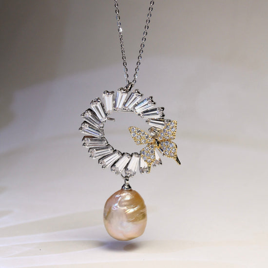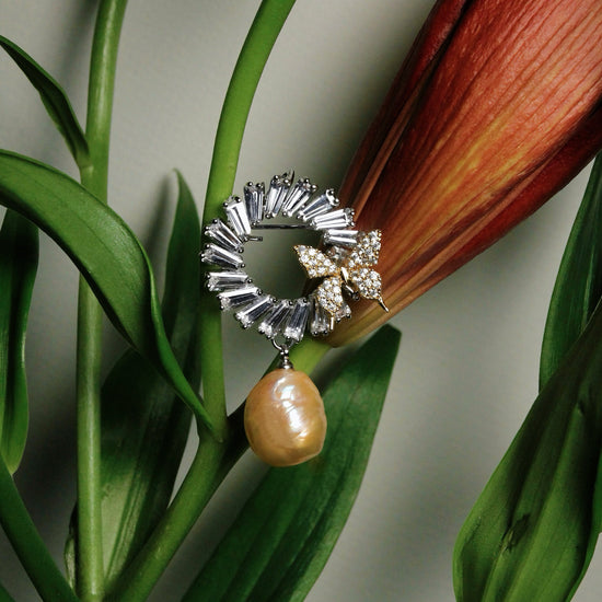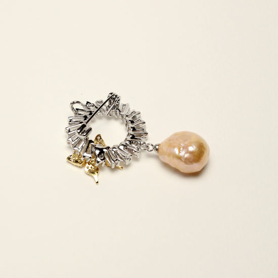 A hand-set circle of baguette-cut cubic zirconia surrounds a golden butterfly, while a luminous baroque freshwater pearl — each over 10mm and uniquely shaped — hangs gracefully below.