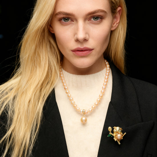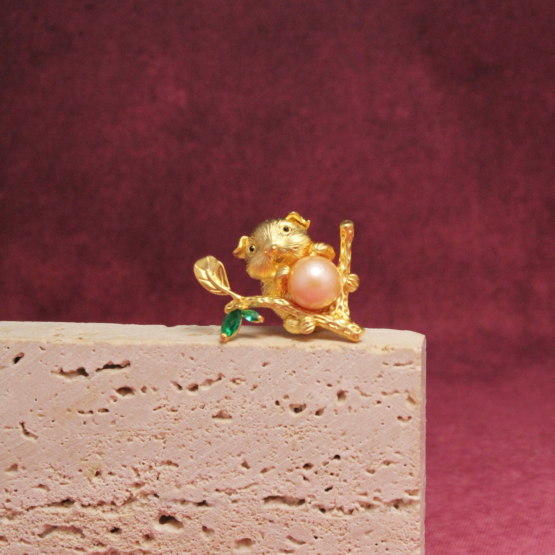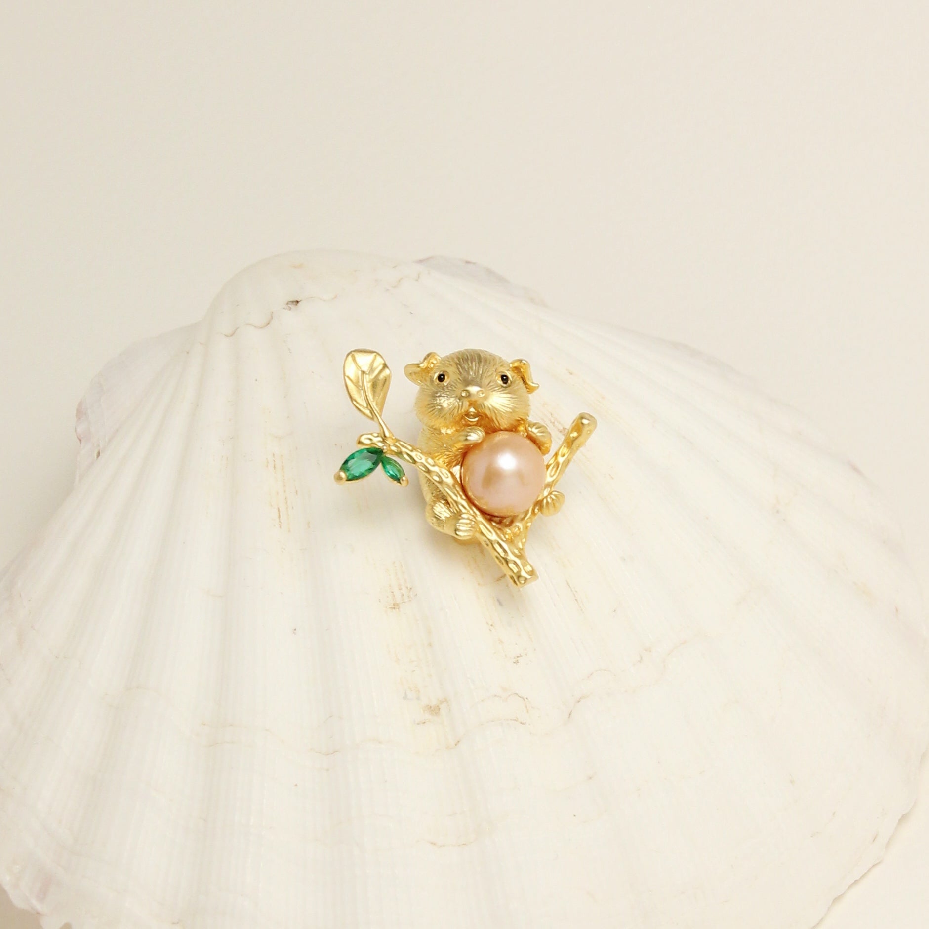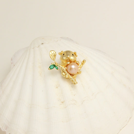 Inspired by the quiet poetry of woodland life, the Pink Aurelia Squirrel Brooch captures a fleeting moment of gentleness and guardianship. The squirrel, long associated with patience and the careful keeping of treasures, is depicted cradling a soft pink-gold pearl—its most cherished find.