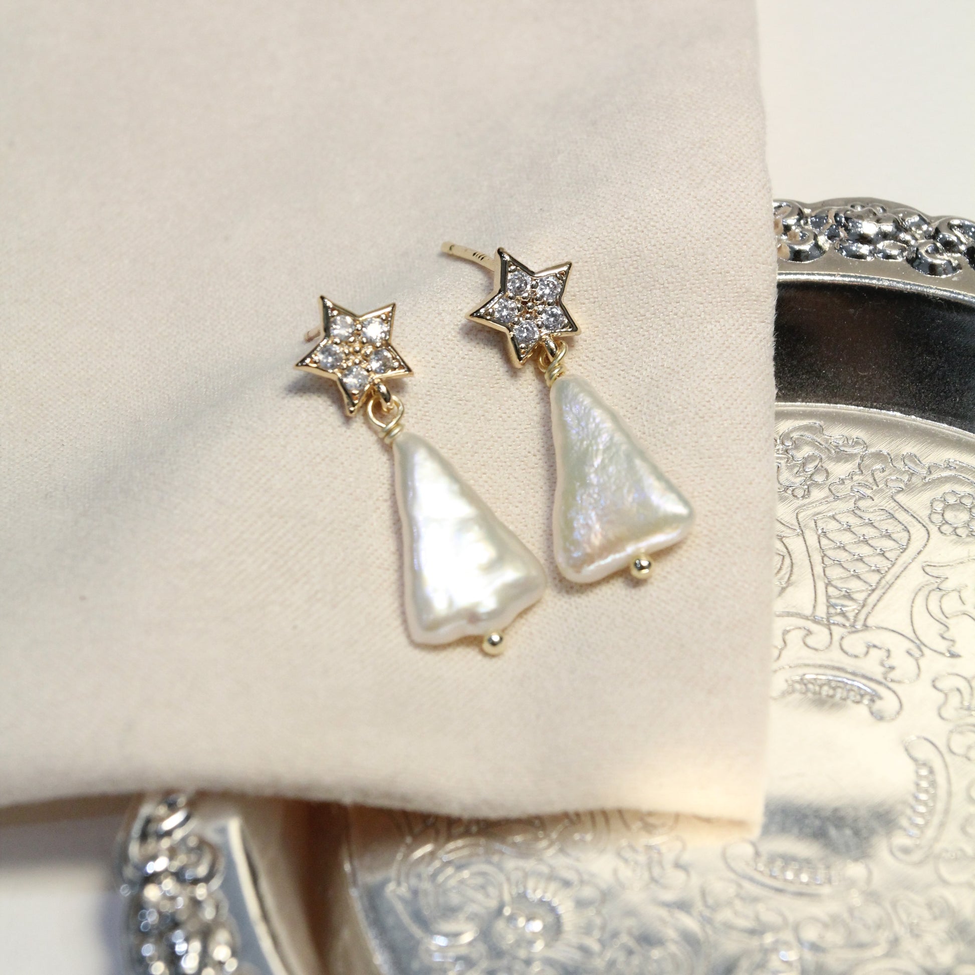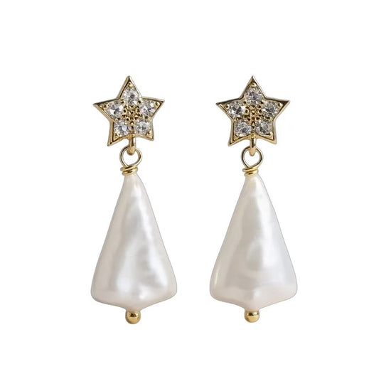 A star-shaped stud set with shimmering cubic zirconia holds a unique triangular freshwater pearl drop, combining festive charm with timeless elegance.