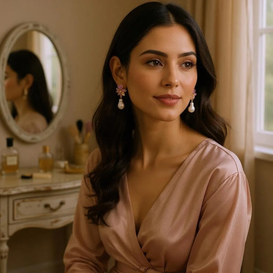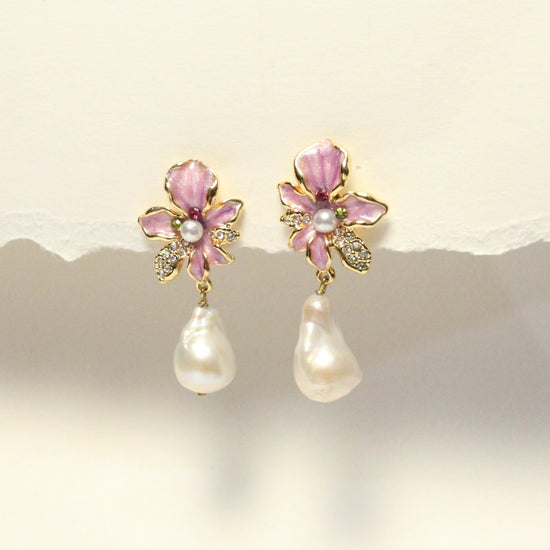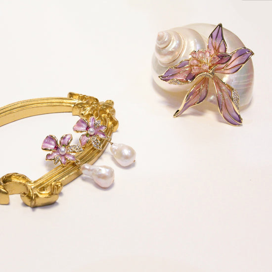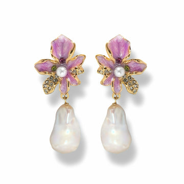 Delicately crafted with lilac enamel petals, gold-filled accents, sparkling zirconia, and natural baroque pearls, the Iris Bloom Earrings capture the poetic grace of spring blossoms. Ideal for weddings, garden parties, or everyday elegance, these earrings whisper floral romance with every movement.