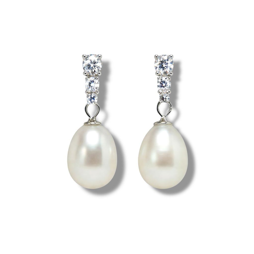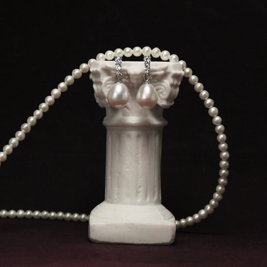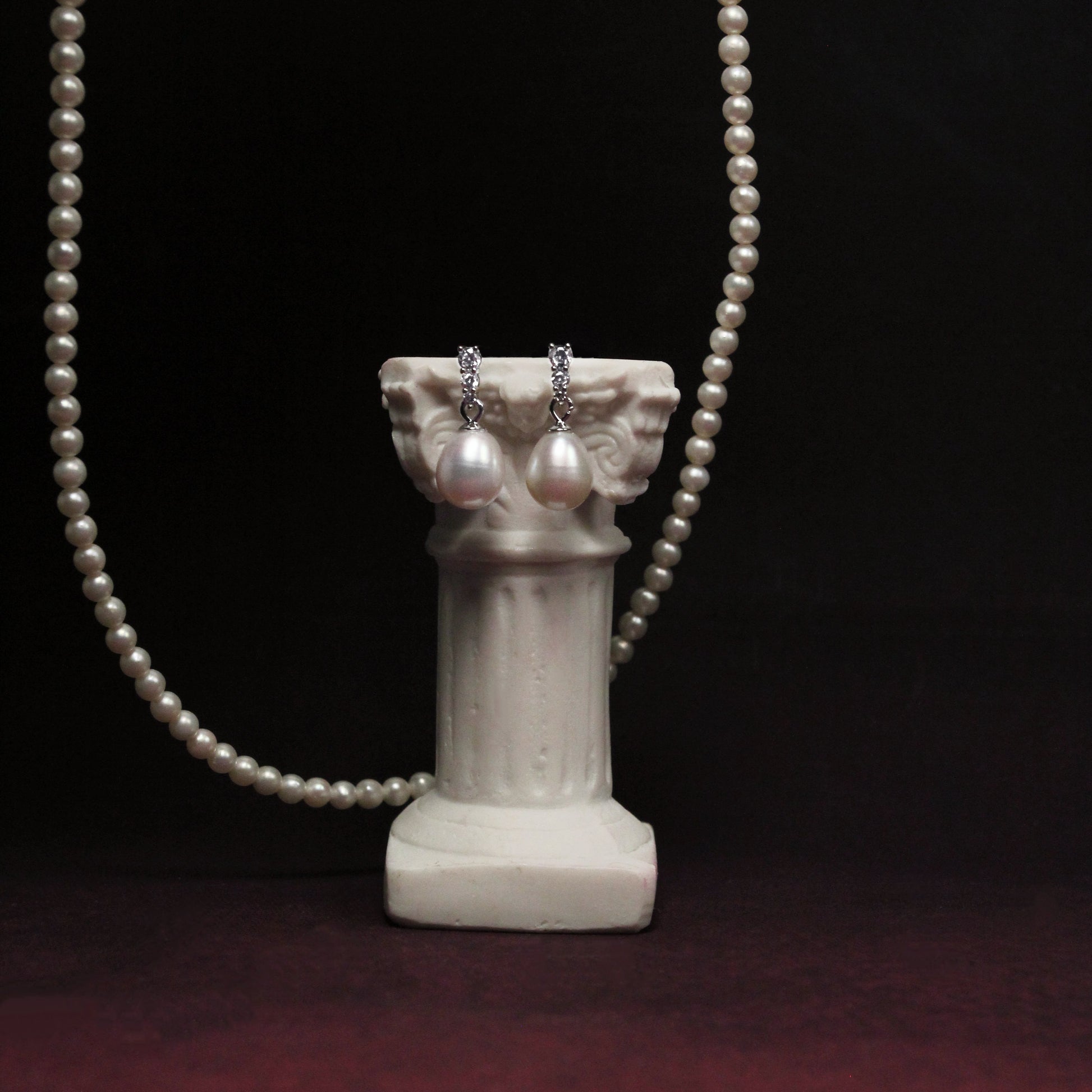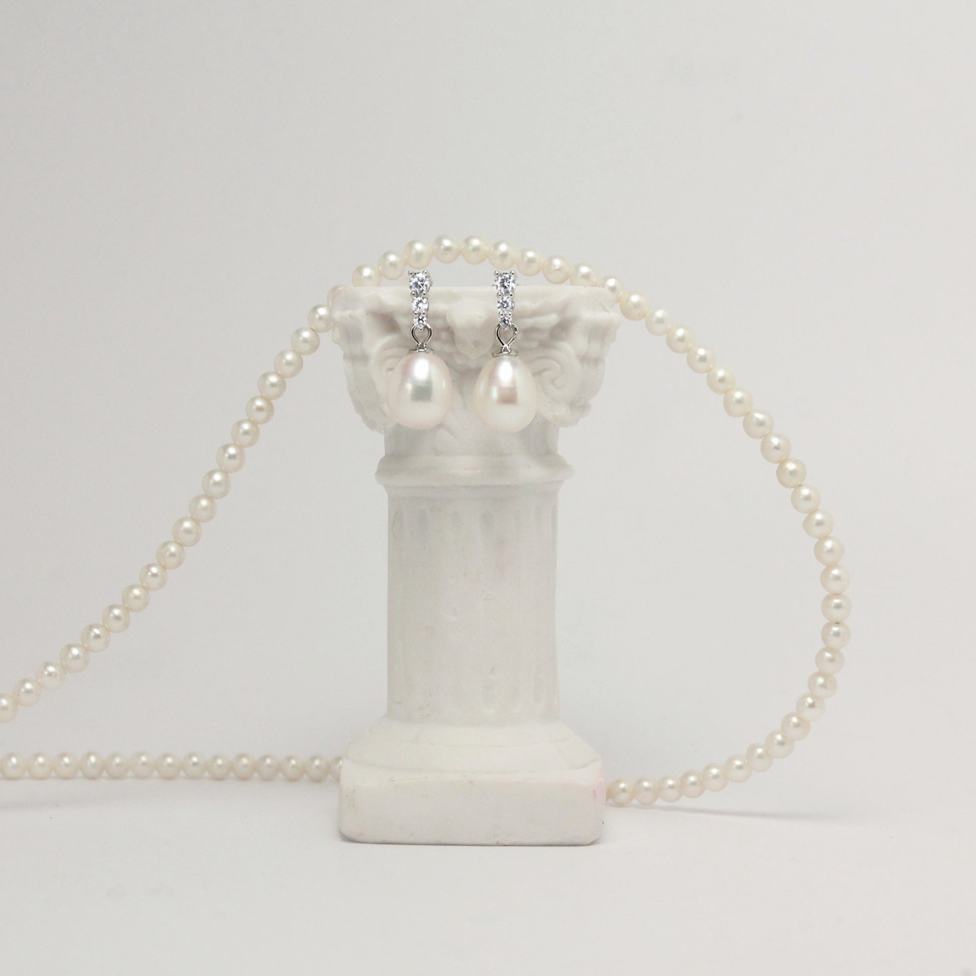 Inspired by the quiet glow of frost, the Givre Drop Pearl Earrings pair luminous freshwater pearls with a refined vertical line of light.