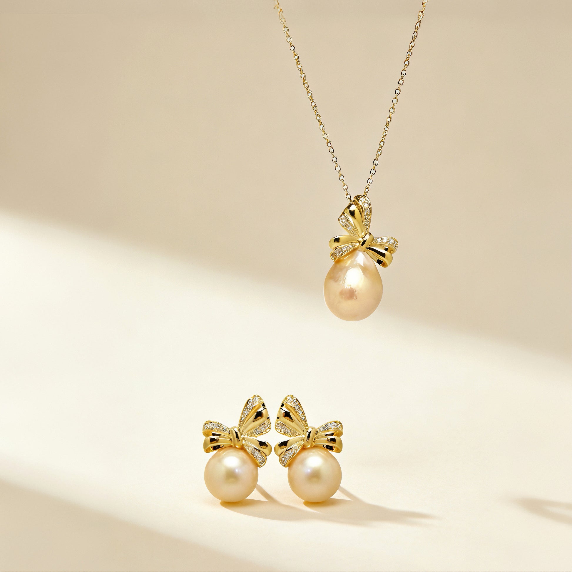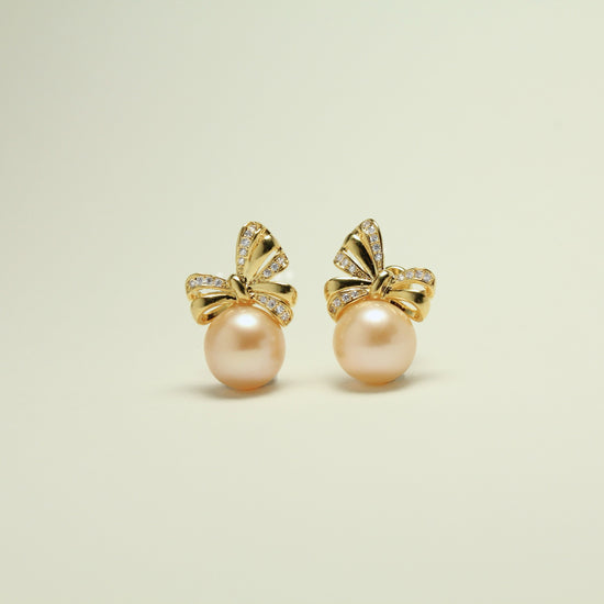 Each earring features a gold-filled bow delicately set with cubic zirconia, gracefully suspending a softly lustrous natural freshwater pearl in a warm golden hue.