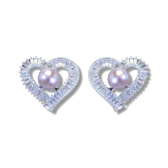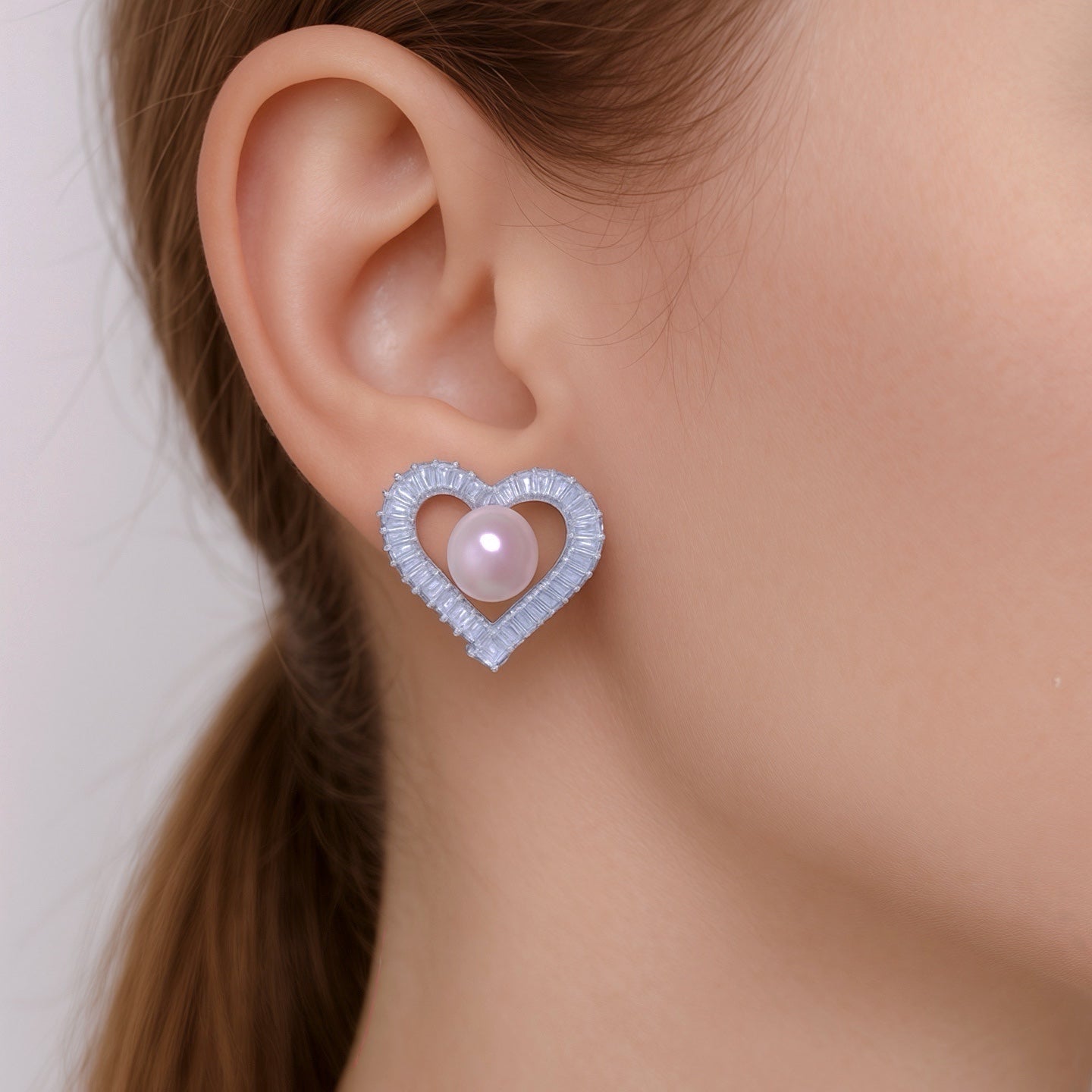 These heart-shaped earrings feature a natural blush pink freshwater pearl at the center, symbolizing purity and affection. Surrounded by sparkling lab-cut zirconia baguettes set in white gold-filled metal, they shimmer with a brilliance that rivals diamonds — but remain effortlessly wearable every day.