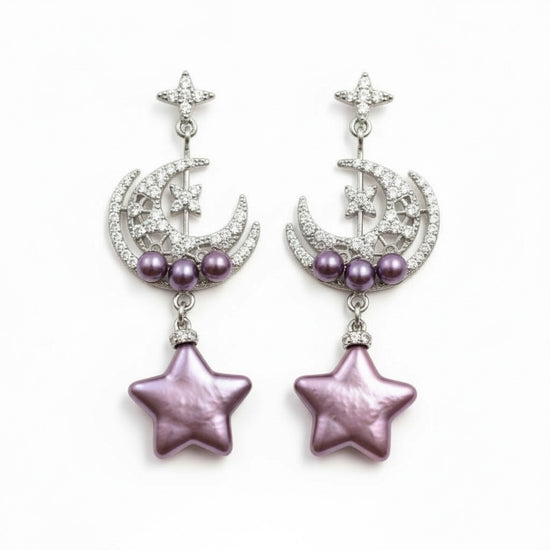 Inspired by moonlit gardens and the quiet poetry of the night sky, the Moonlit Bloom · Violet Star Pearl Earrings bring together celestial motifs and soft colour contrasts.