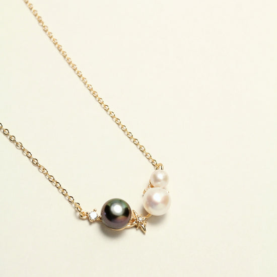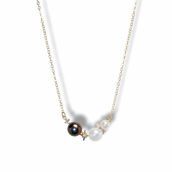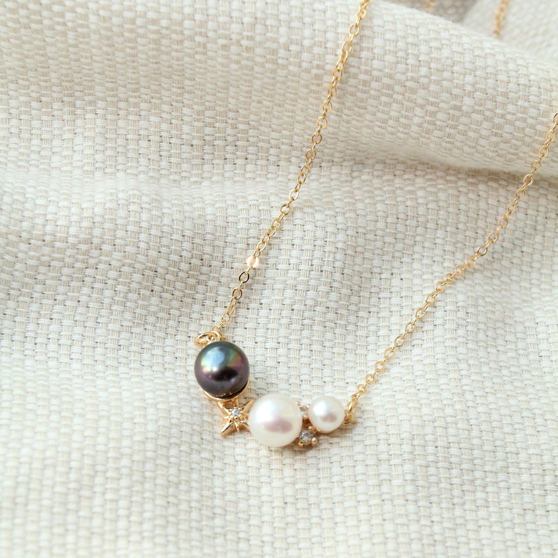 This necklace features three natural freshwater pearls — a luminous black pearl paired with two soft ivory-toned pearls — accented by sparkling zirconia stones that resemble stars in the night sky.
