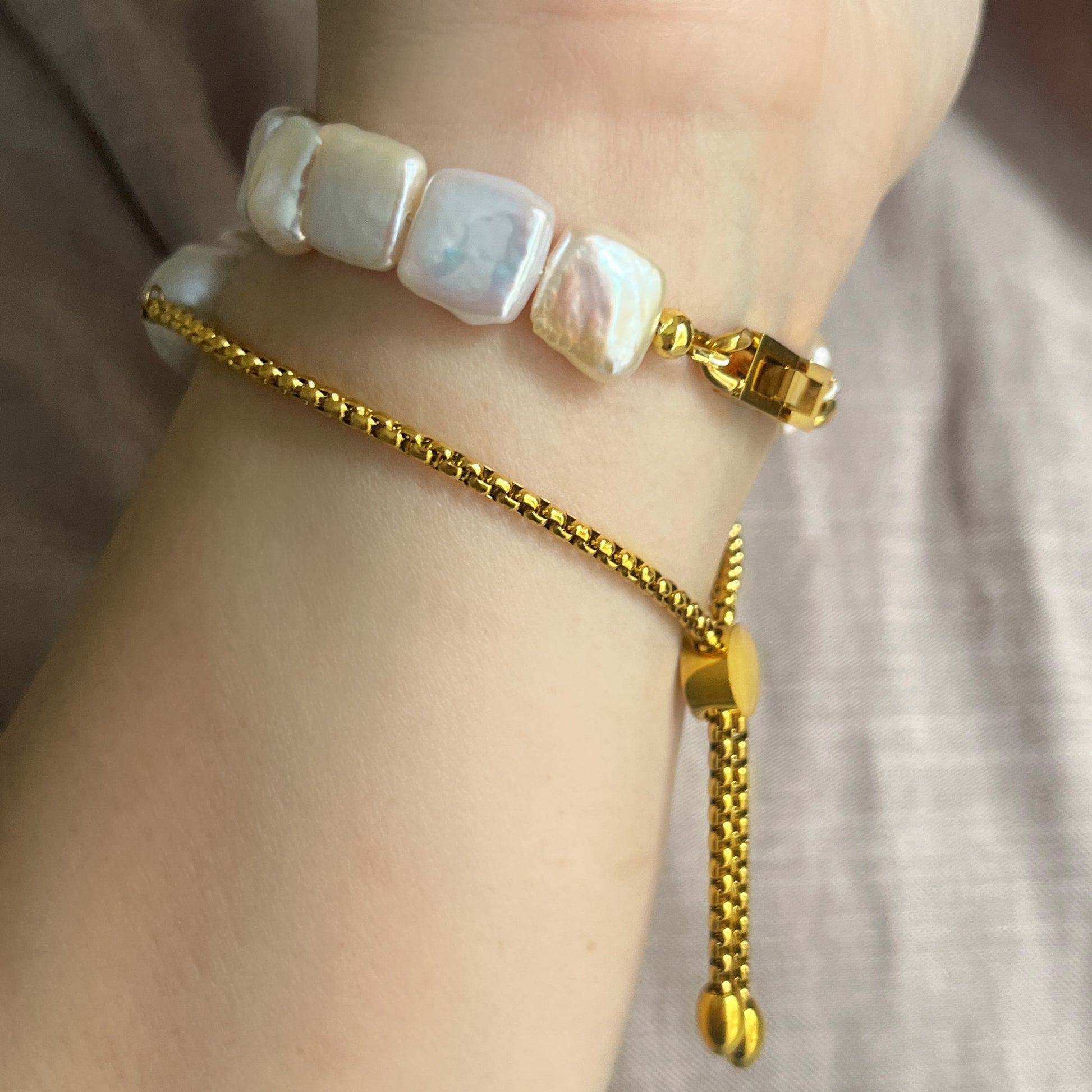With the clean lines of a watch strap and the gentle luster of natural square pearls, this bracelet strikes a balance between geometry and softness. Each pearl is one of a kind, woven into a refined rhythm of logic and emotion. Perfect for everyday wear or layered for a subtle yet striking touch on the wrist.