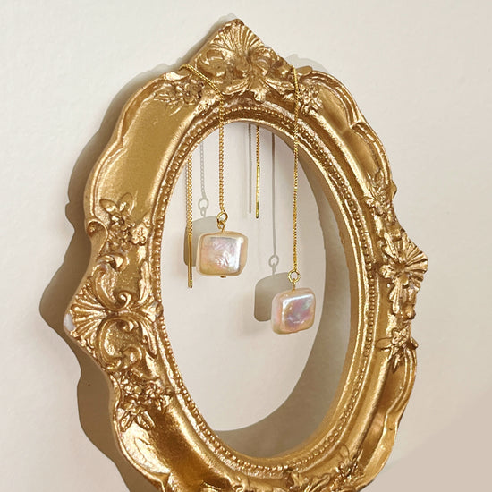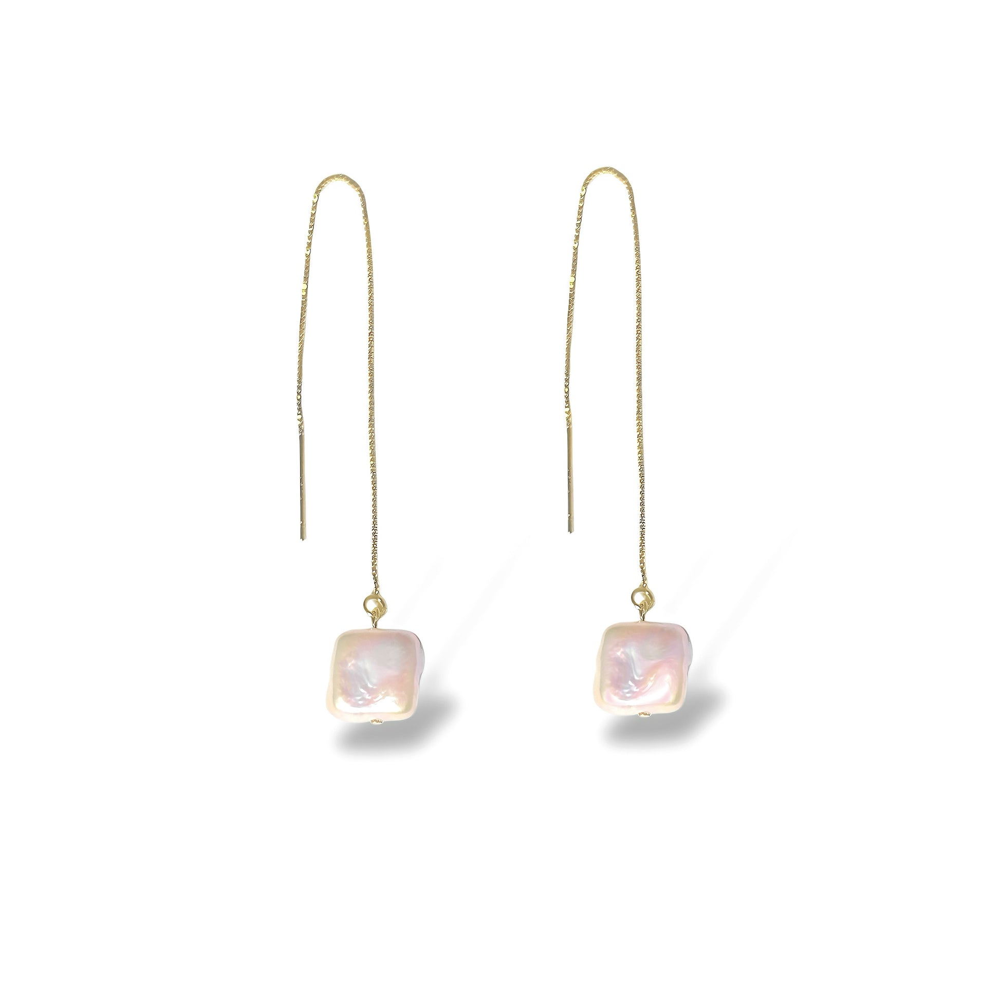 The Mirrorlake Threader Earrings feature natural square freshwater pearls suspended on long, elegant chains — creating a gentle sway with every movement, like ripples in a still lake.