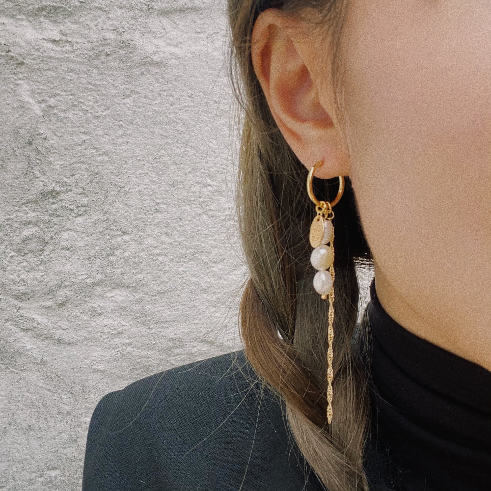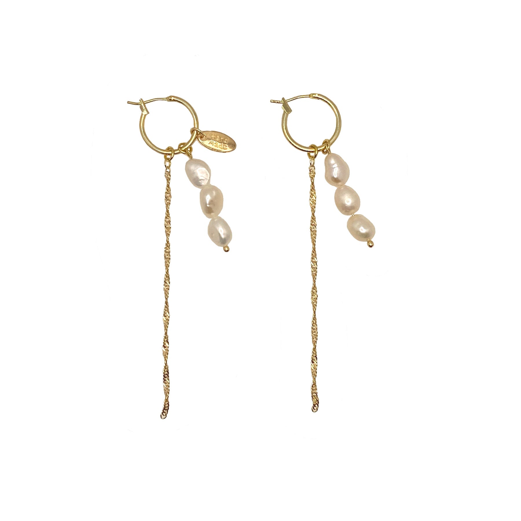 Each of these earrings features a small, round hoop that descends into delicate, 14k gold plated chain drops and 3 unique freshwater pearls.