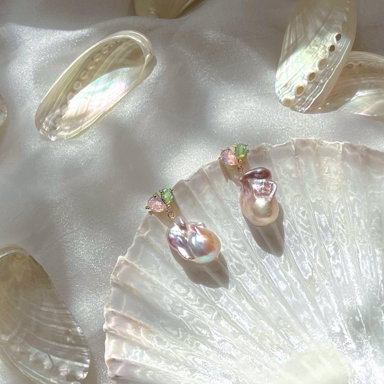 Our Pink Baroque Pearl Shine Earrings feature AAA-grade zirconia in pink and emerald green, paired with natural cherry blossom-hued baroque pearls. The hypoallergenic sterling silver studs ensure comfort, making these earrings both stylish and safe to wear. Pair them with our matching Baroque Pearl Necklace for a stunning, coordinated look.