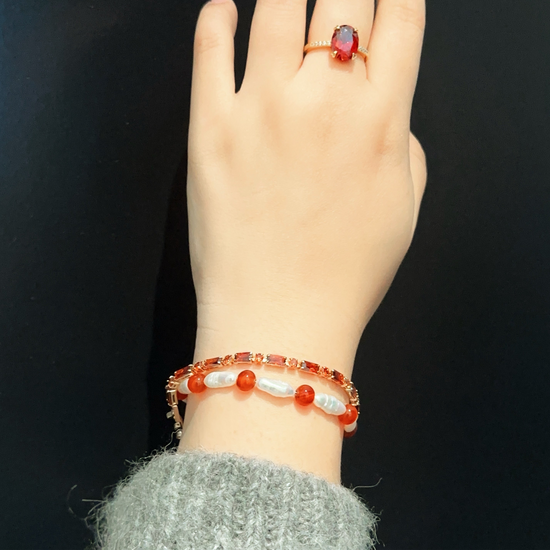 Inspired by the elegance of London's St. James’s Park, this Red Agate & Lute Pearl Bracelet combines rich red agate with graceful lute pearls for a timeless look. The large red agate drop adds a unique touch. Pair it with our matching necklace and earrings for a complete, refined set.