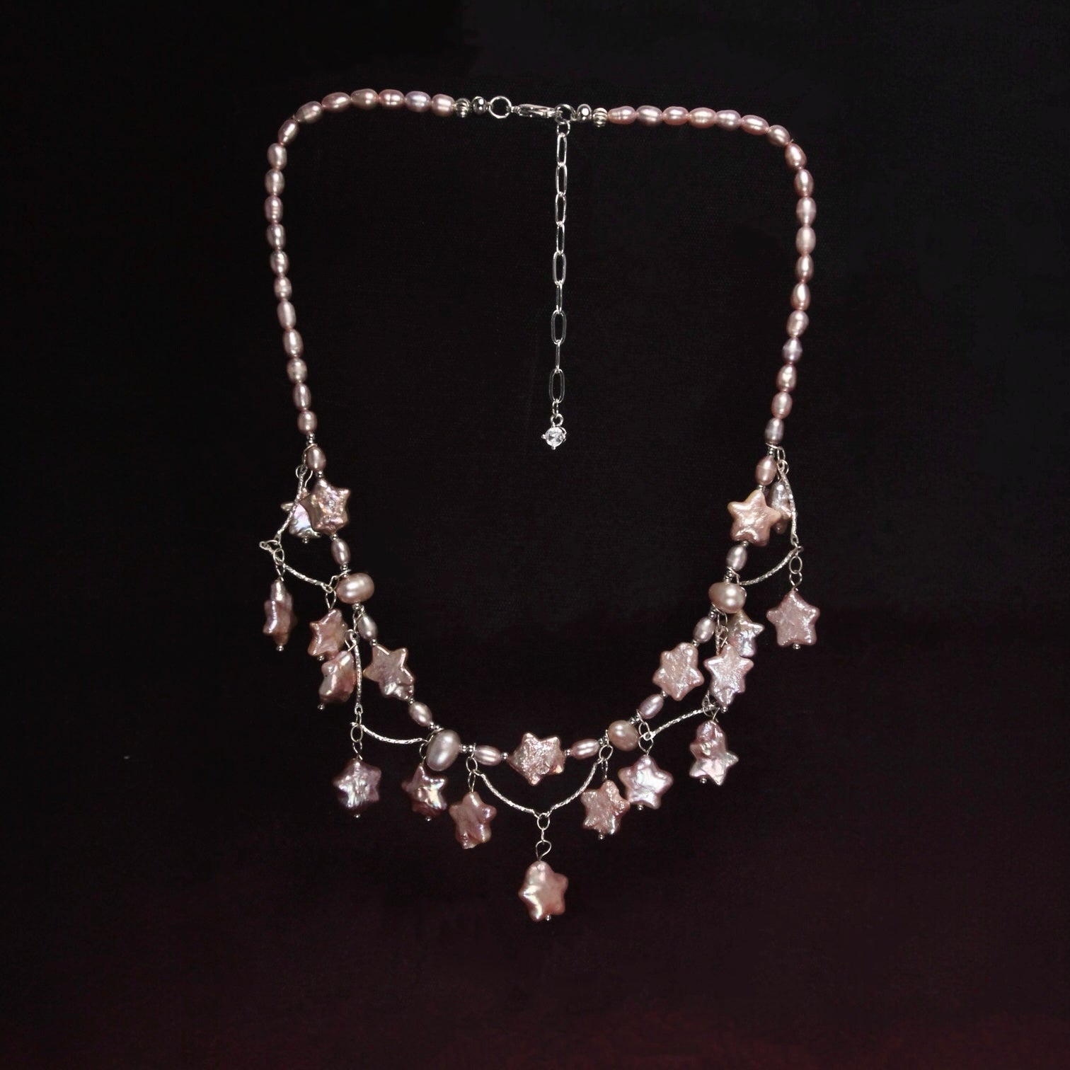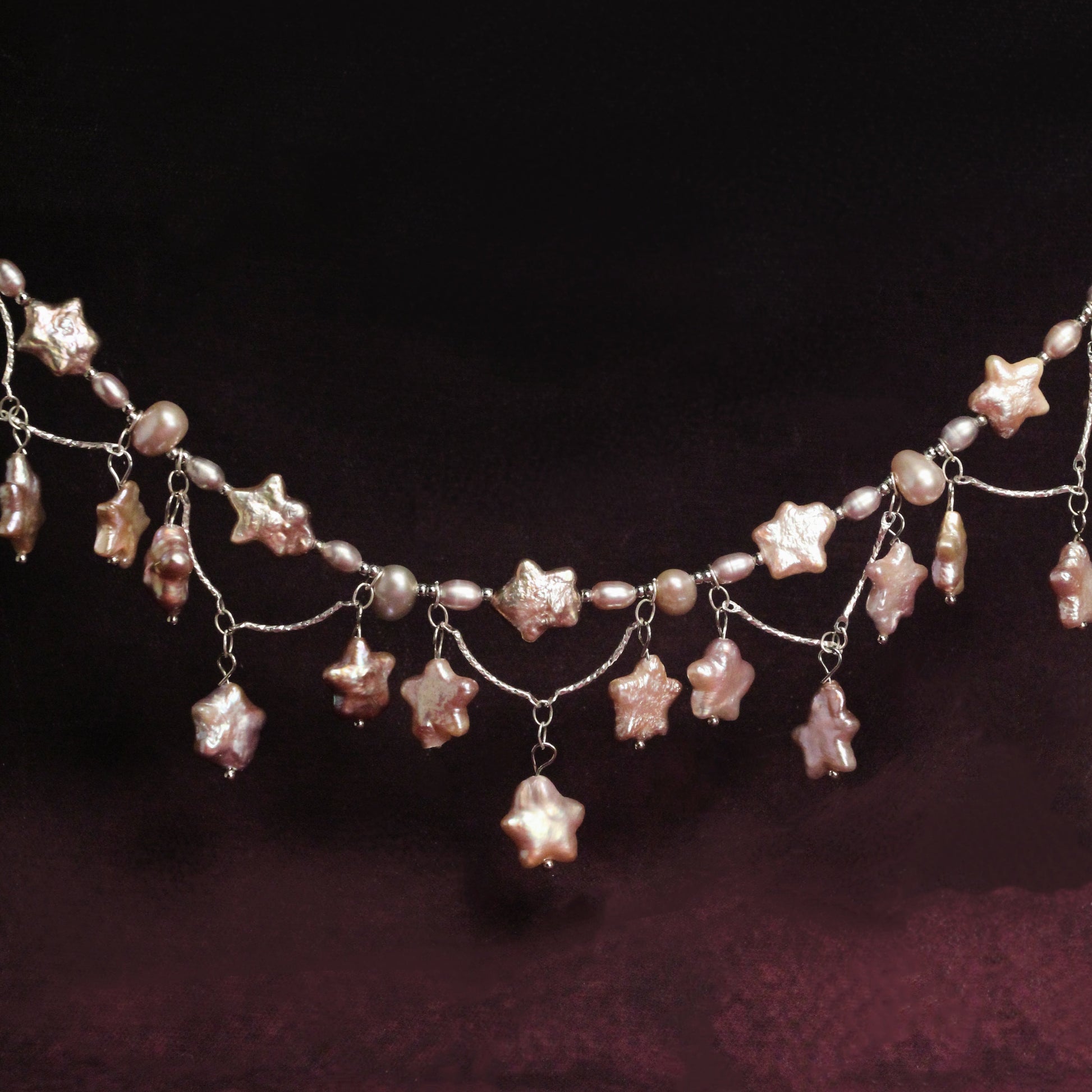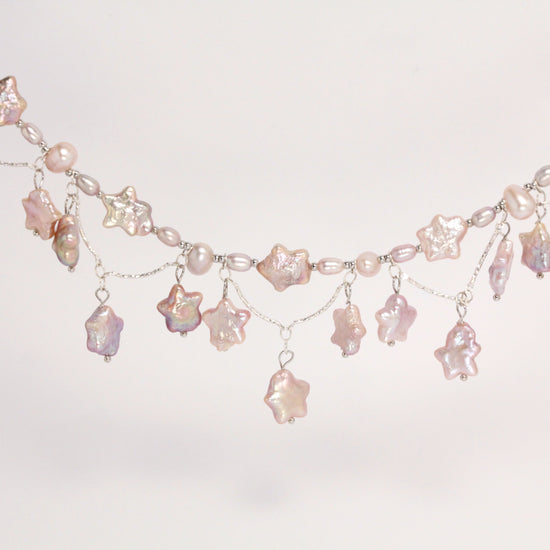 Handcrafted as a bespoke piece for a bride’s fairytale wedding, the Stardust Waltz necklace is a delicate composition of freshwater pearls, zircon accents, and gold- and silver-filled details. Each star-shaped and baroque pearl is thoughtfully arranged to shimmer like falling stardust, echoing the softness of her lavender-toned celebration.