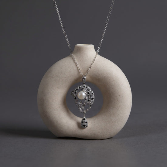 Crafted in platinum-filled metal and encrusted with brilliant cubic zirconia, this exquisite brooch features a sculpted panther — sleek, poised, and protective — gently encircling a single luminous freshwater pearl.